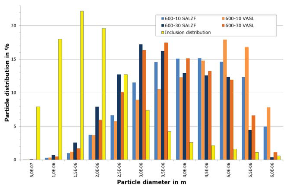 凝聚計(jì)算的初始夾雜物分布來(lái)自堵塞計(jì)量試驗(yàn)臺(tái)的試驗(yàn),如圖79所示。在夾雜物團(tuán)聚檢測(cè)中跟蹤的粒子數(shù)在大約在65000個(gè)和71000個(gè)之間,這取決于中間包的幾何形狀。圖109顯示了中間包鋼水液面為600mm和在塞棒尖端以下15mm不同的塞棒升高下的兩臺(tái)工業(yè)連鑄機(jī)的結(jié)塊顆粒分布情況,SALZF鋼廠結(jié)果為藍(lán)色,VASL鋼廠結(jié)果為橙色。當(dāng)塞棒升高為30 mm時(shí),即塞棒區(qū)域的速度水平較低時(shí),峰值分別為3.0 μm和3.5 μm。當(dāng)塞棒升高為10 mm時(shí),即塞棒區(qū)速度較高時(shí),峰值分別為4.5 μm和5.0 μm。第一個(gè)結(jié)論是,小的塞棒升高高度與較高的速度水平相關(guān),導(dǎo)致夾雜物更強(qiáng)的團(tuán)聚現(xiàn)象,形成更大直徑的非金屬夾雜物。基本上,與附錄C.1中報(bào)告的結(jié)果相比,夾雜物初始分布的變化導(dǎo)致了夾雜物尺寸分布的變化,峰值直徑總體上看較小。