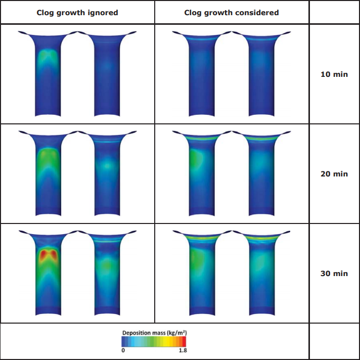 為了描述流體流動(dòng)和阻塞增長(zhǎng)之間雙向耦合的重要性,進(jìn)行了一個(gè)附加的數(shù)值模擬,忽略了阻塞增長(zhǎng)的步驟。這是通過(guò)在撞擊壁面后去除非金屬夾雜粒子來(lái)實(shí)現(xiàn)的。不同時(shí)間浸入式水口SEN壁上顆粒沉積質(zhì)量分布如圖112所示。兩種情況下的所有模擬設(shè)置是相同的。只有一種情況(左列)忽略了堵塞增長(zhǎng)步長(zhǎng),即左列為單向耦合結(jié)果,右列為流體流動(dòng)與堵塞增長(zhǎng)的雙向耦合結(jié)果。考慮到阻塞的生長(zhǎng),將計(jì)算單元的夾雜物沉積凸出水口內(nèi)腔壁面上,可以比較兩種情況(考慮和不考慮阻塞生長(zhǎng)步驟)的沉積質(zhì)量結(jié)果。兩種模擬的粒子注入速率均為1.21 x 10-4 kg/s。結(jié)果表明,兩種情況下顆粒沉積的臨界區(qū)域即堵塞是不同的,在無(wú)阻塞生長(zhǎng)的情況下,臨界區(qū)在塞棒和水口的間隙區(qū)以下。考慮到堵塞的增長(zhǎng)顯示了額外的夾雜物沉積,即間隙似乎也是堵塞的關(guān)鍵因素,因此,忽略阻塞生長(zhǎng)對(duì)顆粒沉積的影響可能會(huì)導(dǎo)致模擬結(jié)果的錯(cuò)誤。