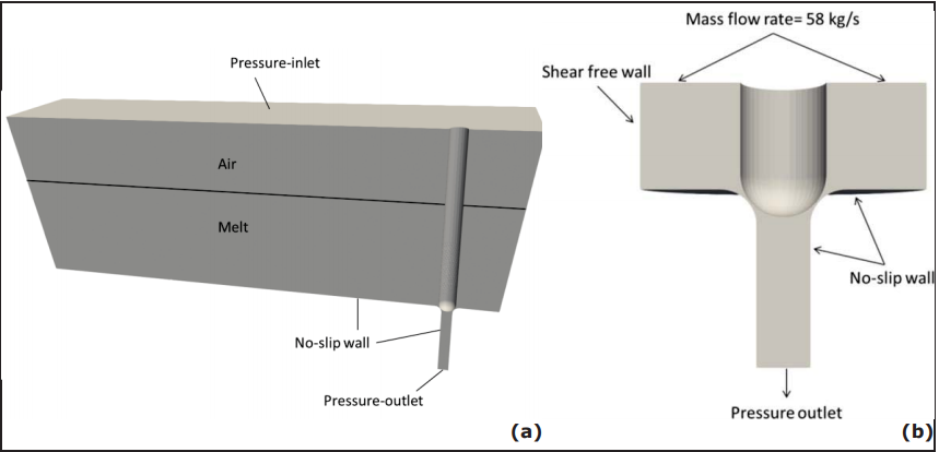 在UNILEOB-SMMP中,過(guò)程模擬分兩個(gè)步驟進(jìn)行,計(jì)算域的幾何形狀和邊界條件如圖111所示。步驟1考慮具有水口SEN上部的中間包,如圖111 (a)所示,目的是為了找到堵塞模擬所需的塞棒位置和合適的流動(dòng)邊界條件,如圖111 (b)所示,即在簡(jiǎn)化的計(jì)算域內(nèi)的步驟2,塞棒間隙不斷變化,直到達(dá)到鋼水的目標(biāo)流通量。對(duì)于第一步的計(jì)算,考慮了鋼液和空氣的兩相流動(dòng),利用獲得的基于目標(biāo)鋼水流通量的間隙尺寸信息,設(shè)計(jì)了用于第二步堵塞模擬靠近塞棒區(qū)域的幾何形狀。
