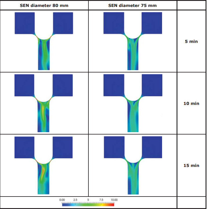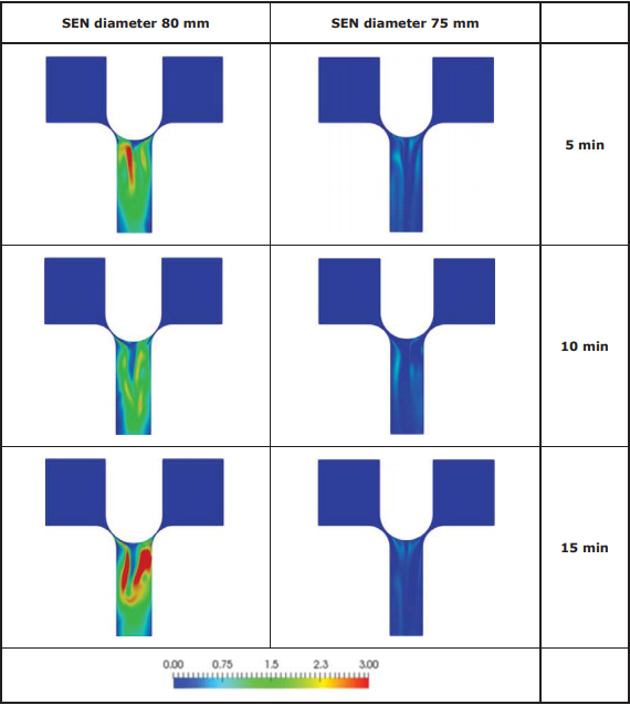 可以從兩個(gè)不同水口流動(dòng)模型發(fā)現(xiàn)可能的原因,較大直徑的水口需要較小的塞棒間隙尺寸,以保持鋼水流通量恒定,因此,如圖115和圖116所示,相對(duì)于較小水口,較大水口內(nèi)的鋼水速度和湍流動(dòng)能都較大。在這里,速度和湍流動(dòng)能用三次不同的時(shí)間段說(shuō)明。