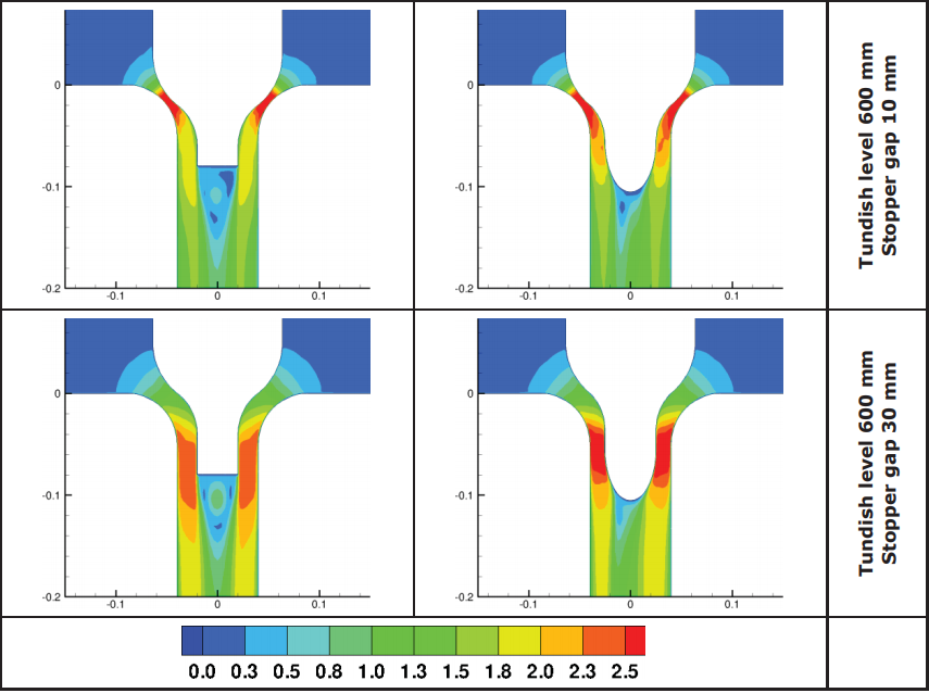 圖105 改進(jìn)塞棒增加鋼水流通量。中間包鋼水液面高度600毫米(BFI)