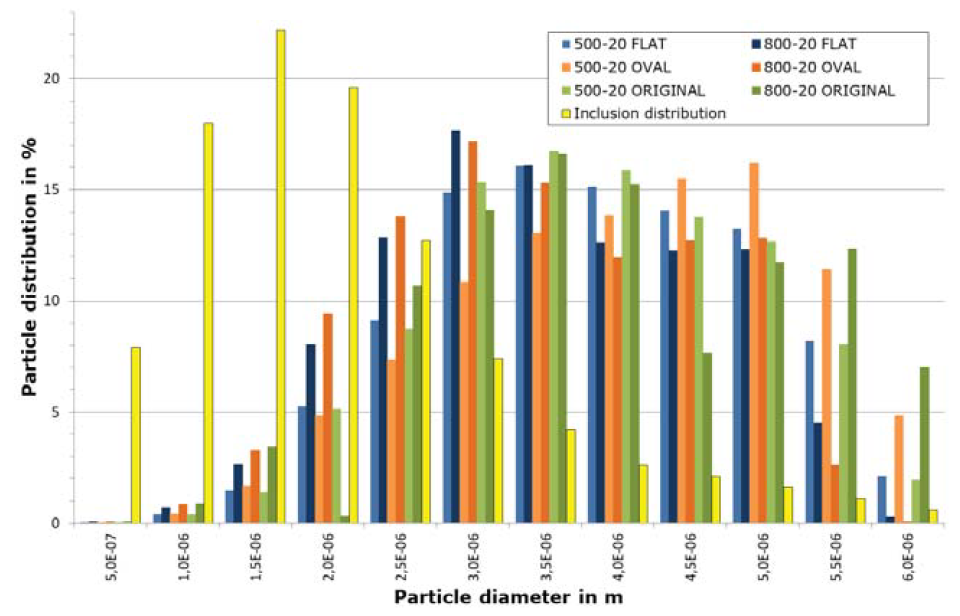 圖121顯示了根據(jù)中間包鋼水液面高度對(duì)塞棒進(jìn)行扁平和橢圓形修改后的夾雜物團(tuán)聚結(jié)果。附錄C.3中報(bào)告的主要結(jié)果得到了證實(shí),即塞棒提升高度越小,非金屬夾雜物的直徑越大。雖然塞棒間隙內(nèi)的速度發(fā)生了明顯的變化,但塞棒幾何形狀的改變對(duì)非金屬夾雜物的團(tuán)聚影響很小。