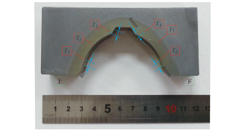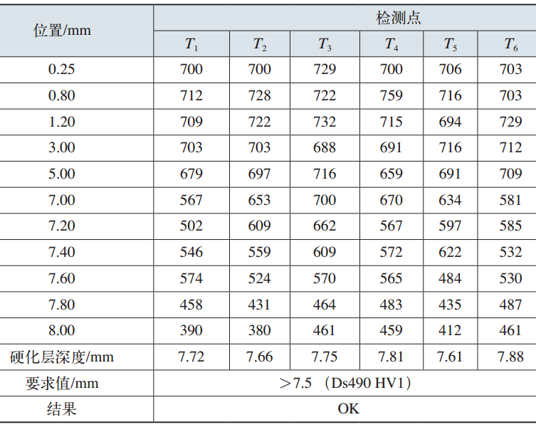 產品:外圈溝道FLHSN3035FT1,材質為42CrMo4+QT-EN10083,溝道淬火硬度58~62HRC,硬化層深度≥7.5mm(52.5HRC處)。實物如圖4所示,圖樣工藝要求如圖5所示,硬化層切割試塊如圖6所示,檢測結果見附表,金相組織如圖7所示。