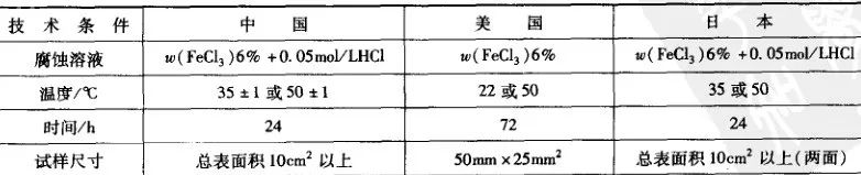 中國、美國及日本曾對不銹鋼用FeCl3 溶液進行點蝕試驗的主要技術條件如表2 所示,供讀者參考。浸泡后的試樣用肉眼或放大鏡、低倍顯微鏡進行檢查、記錄及拍照。然后除掉腐蝕產物,精確稱重(0.1mg) , 用帶網格的透明紙數出試樣單位面積上(1cm2) 蝕孔數目。用蝕孔深度測量儀或光學顯微鏡測定蝕孔深度。測出20個蝕孔中最大蝕孔深度和10個蝕孔平均深度。
