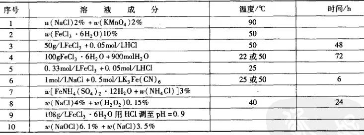 ▼表1 化學浸泡法常用點蝕溶液成分及實驗條件