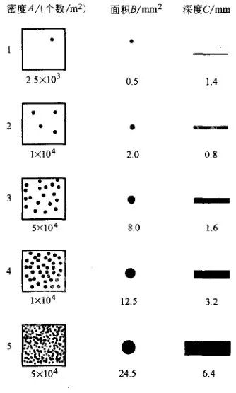 點蝕性能評定時失重法應用最廣泛,用點蝕率[g/ (㎡·h) ] 或平均腐蝕速度(mm/a) 表示。圖1 所示為美國 ASTM G46-1994點蝕試驗標準中,按蝕孔密度、尺寸和深度的評定標準。圖1 所示為蝕孔斷面特征。