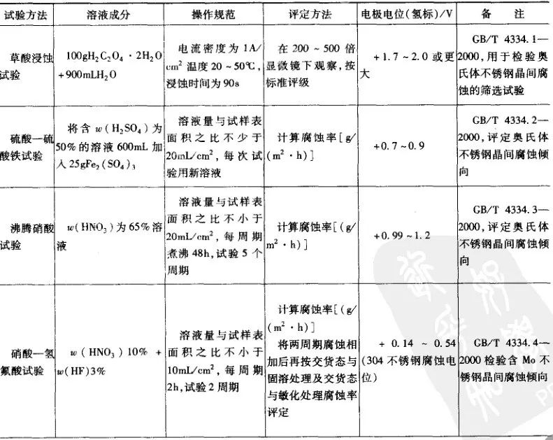 晶間腐蝕試驗方法很多,其原理及適用范圍各不相同,不同的材料和介質應當選用不同方法。晶間腐蝕試驗方法可分為三大類,一是化學浸泡法,應用廣泛,較為成熟,其中一些方法已被一些國家列為國標;二是電化學法,其特點是試驗時間短,不破壞試樣;三是物理試驗法,其中以金相法和彎曲法應用較廣泛。
