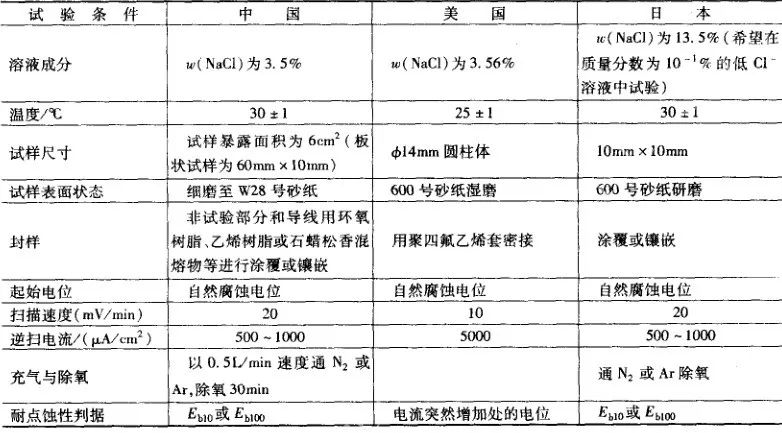 中國、美國及日本曾用動電位法測定不銹鋼點蝕電位的主要技術條件見表15供讀者參考。