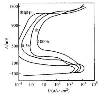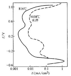 有恒電位法與動電位法,恒電位法測定晶間腐蝕是依據晶間腐蝕敏感材料的陽極極化行為與耐晶間腐蝕材料不同。例如晶間腐蝕敏感材料的腐蝕電流大于非敏感材料,圖3 所示為奧氏體不銹鋼的陽極極化曲線,圖4所示為鐵素體不銹鋼的陽極極化曲線。還可用陽極極化曲線形狀或第二陽極峰形狀判斷晶間腐蝕傾向。