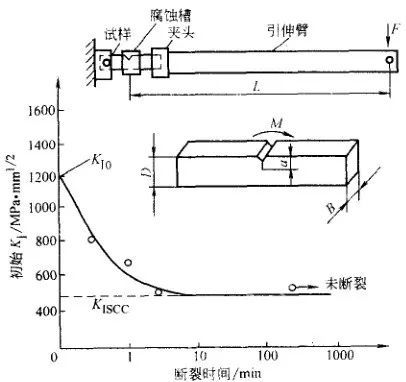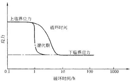 材料在靜載荷作用下,裂紋萌生。低速擴展,失穩斷裂。圖26 所示為高強度鋼延遲斷裂曲線,圖中的下臨界應力是延遲斷裂臨界應力,低于此值時應力作用時間再長也不發生破斷。