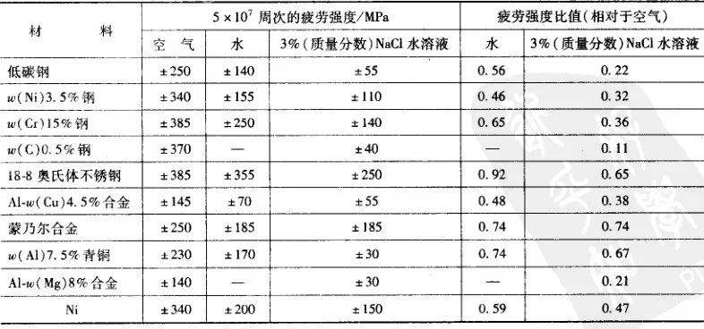 金屬材料在交變載荷與腐蝕介質同時作用下引起的破壞為腐蝕疲勞。腐蝕疲勞與應力腐蝕有相似之處,但又有區別、應力腐蝕是材料在特定介質中,一般在拉應力作用下發生的低應力破斷;而腐蝕疲勞是在交變載荷作用下,在任意腐蝕介質中引起的破壞。應力腐蝕與腐蝕疲勞間的界限不是十分清晰。材料的腐蝕疲勞強度比普通大氣介質下疲勞強度顯著降低。腐蝕疲勞是機械零件常見的破壞形式,例如石油鉆桿用鋼中70%~80%是腐蝕疲勞失效。表13是一些結構用金屬材料在不同介質中的疲勞強度比較。