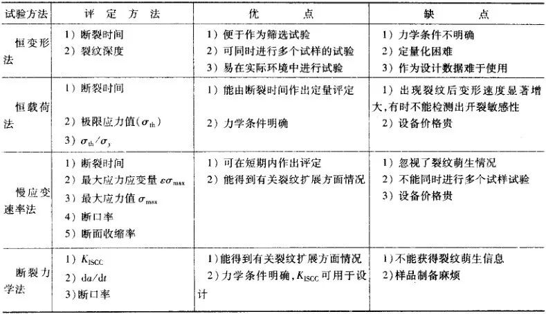 將幾種應力腐蝕試驗方法列于表13。由于各種試驗方法的評定對象和優缺點各不相同,選用時應符合要求,并且必須考慮實驗室和實際環境有無對應性,并要積累這方面的數據。