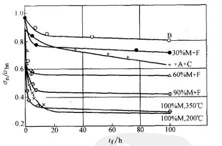 即應力(σ) 與時間(t) 曲線,求出試樣不斷時的應力門檻值(σth) , 即下臨界應力。圖30所示為20MnVB鋼不同組織的延遲斷裂曲線,縱坐標為試樣在含氫介質中的斷裂應力(σn) 與大氣介質中材料缺口試樣強度(σbn) 之比,橫坐標為斷裂時間(t) 。