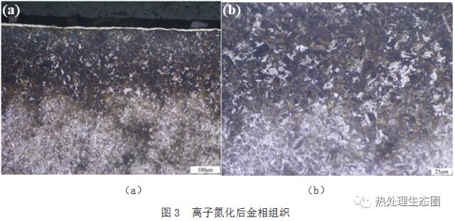 離子氮化處理后的錐環(huán)支板金相檢測(cè)結(jié)果如圖3所示。其氮化層是由表面白亮層和擴(kuò)散層組成,圖3a所示為低倍下表面白亮層和擴(kuò)散層的金相照片,可以看出表面白亮層的厚度是比較均勻的。測(cè)得硬化層的層深為0.28mm,白亮層深度為8μm,表面硬化層的硬度為530~540HV。其中表面氮化層的金相組織如圖3b所示,其組織由含氮的板條馬氏體+屈氏體團(tuán)+回火索氏體+少量鐵素體組成。采用專用量具測(cè)得內(nèi)齒的圓度變形為0.05~0.07mm,支板平面變形度均值為0.07mm,滿足變形技術(shù)要求。綜上述分析,改善后的離子氮化工藝獲得了質(zhì)量合格的錐環(huán)支板。