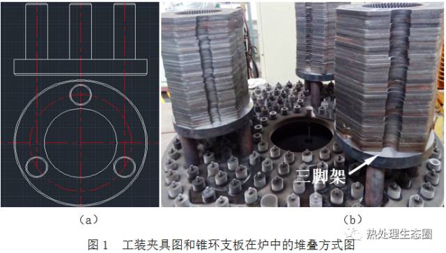 研究發(fā)現(xiàn)導(dǎo)致錐環(huán)支板變形較大的原因在于錐環(huán)支板在爐內(nèi)擺放方式不合理,錐環(huán)支板與氮化爐底面直接接觸,氮化爐底面因?yàn)殚L(zhǎng)期使用發(fā)生變形或是爐內(nèi)有雜質(zhì)、坑洼等缺陷都會(huì)導(dǎo)致堆疊在爐內(nèi)的錐環(huán)支板處于一個(gè)非水平狀態(tài),錐環(huán)支板的堆疊將會(huì)發(fā)生偏移而錯(cuò)亂,加熱過程中錐環(huán)支板因堆放錯(cuò)亂上下受力不均和加熱及冷卻不均而產(chǎn)生變形,因此,設(shè)計(jì)相應(yīng)的工裝改善錐環(huán)支板在氮化爐內(nèi)的擺放形式尤為必要。