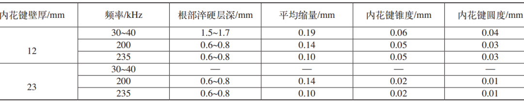 (2)使用200~400kHz的高頻感應(yīng)加熱淬火設(shè)備因?yàn)轭l率過高,熱能量從內(nèi)花鍵頂部傳導(dǎo)至內(nèi)花鍵根部。在相同的淬硬層深度時,不同的頻率選擇,變形數(shù)據(jù)也有差異。當(dāng)頻率選擇200kHz時,內(nèi)花鍵根部淬硬層深為0.6~0.8mm,符合圖樣技術(shù)要求。熱處理前后對比,內(nèi)花鍵變形平均縮量在0.14mm。當(dāng)頻率選擇235kHz時,內(nèi)花鍵根部硬化層深為0.6~0.8mm,符合圖樣技術(shù)要求。熱處理前后對比,內(nèi)花鍵變形平均縮量在0.10mm(見表1)。