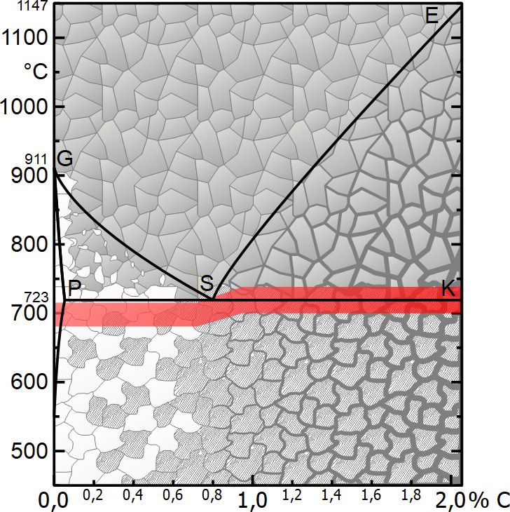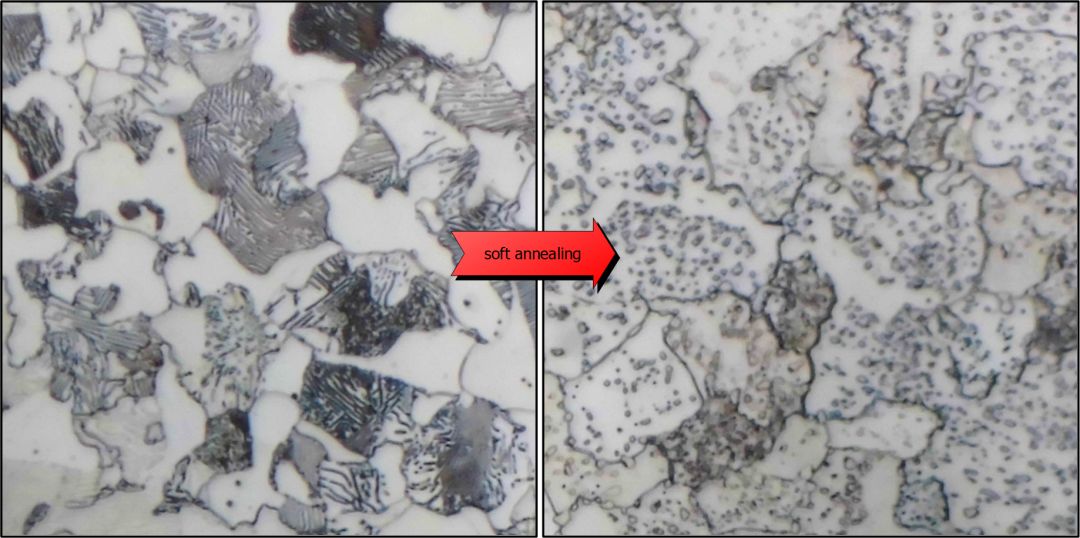 在軟化退火過(guò)程中,亞共析鋼被剛好加熱到PS線以下,這樣滲碳體就不會(huì)分解。層狀滲碳體現(xiàn)在有足夠的時(shí)間通過(guò)擴(kuò)散過(guò)程轉(zhuǎn)變成熱力學(xué)上更有利的圓形。珠光體中的條狀滲碳體轉(zhuǎn)變?yōu)榍驙顫B碳體。滲碳體分解成圓形后,鋼慢慢冷卻。與亞共析鋼相比,過(guò)共析鋼在軟化退火過(guò)程中加熱,溫度略高于或圍繞PSK線振蕩。