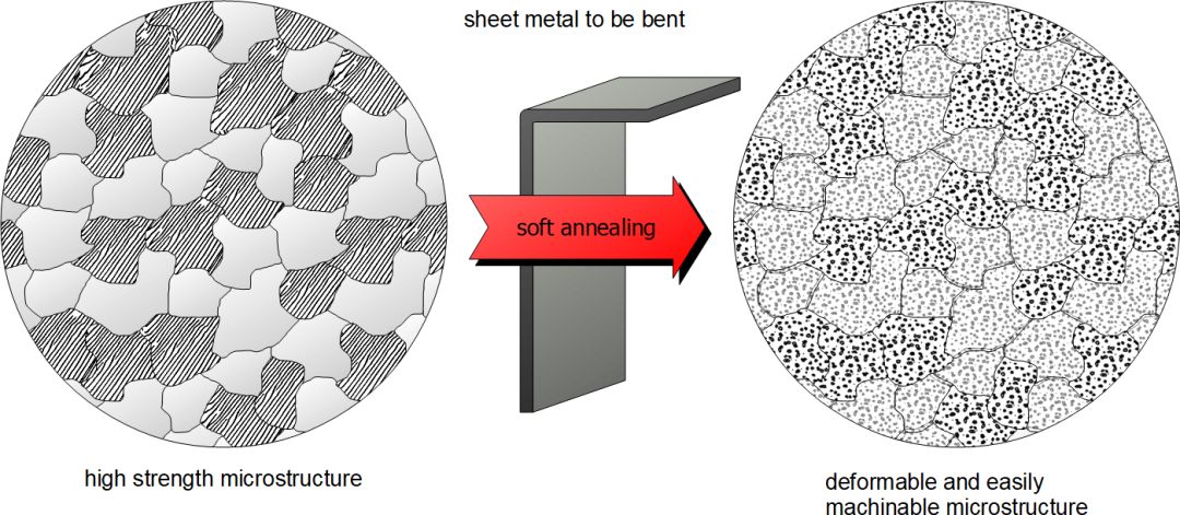 并非所有材料都必須設(shè)計(jì)成能承受很高的機(jī)械載荷。例如,對(duì)于帶有銑槽的彎曲金屬板,材料不必能夠吸收高強(qiáng)度的力。相反,材料選擇的重點(diǎn)是鋼的良好成形性和可加工性。為了生產(chǎn)更經(jīng)濟(jì),這在大批量自動(dòng)化生產(chǎn)中發(fā)揮著重要作用。因此,可能有必要調(diào)整鋼的微觀結(jié)構(gòu),使其能夠更好地成形和/或加工。特別是在成形性方面,因此有必要產(chǎn)生相應(yīng)的軟化組織。這可以通過(guò)所謂的軟化退火來(lái)實(shí)現(xiàn)。