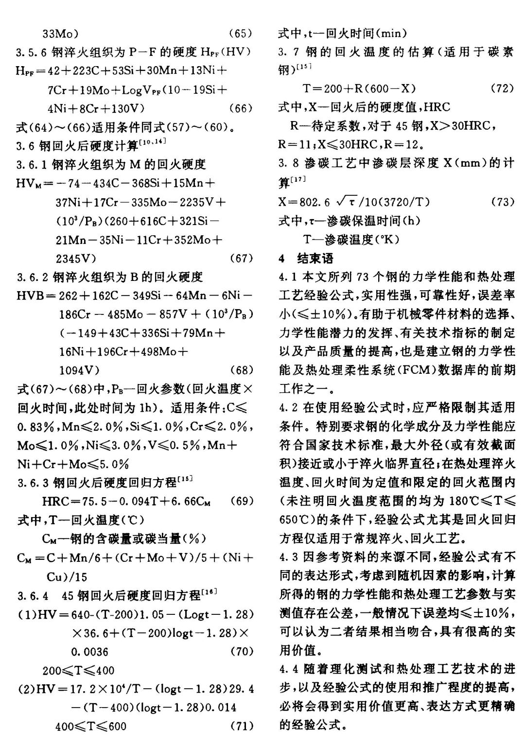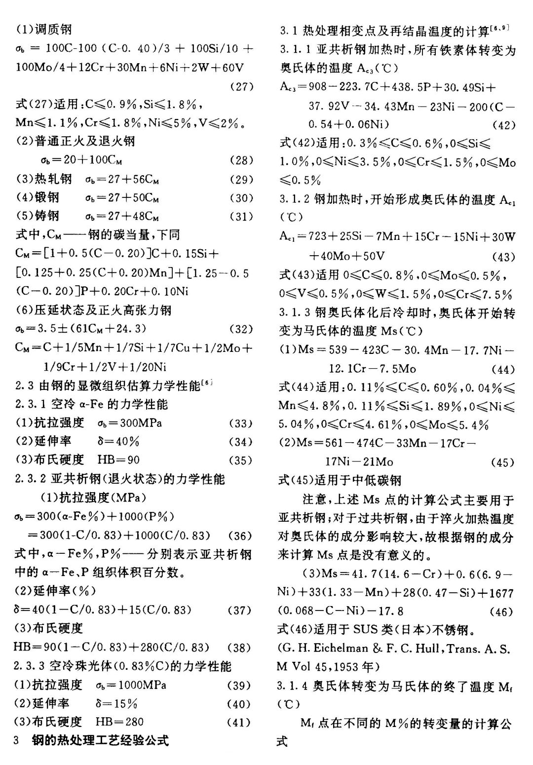【摘要】本文主要收集整理出了鋼的力學性能及熱處理工藝經驗公式73個。實踐證明,所列公式具有計算方便、實用性能、可靠性能、誤差率小(≤土10%)的優點。應用經驗公式,可以為機械零件技術設計和制定熱處理工藝規范,提供重要的參考依據,是建立鋼的力學性能及熱處理柔性系統(FCM)數據庫的首要前期工作之一。
