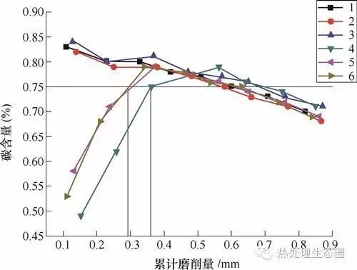 共對(duì)6個(gè)試樣進(jìn)行了8次磨削及表面碳含量的檢測(cè)。各試棒的單次磨削量、累計(jì)磨削量及相應(yīng)的表面碳含量記錄見表1、表2。
