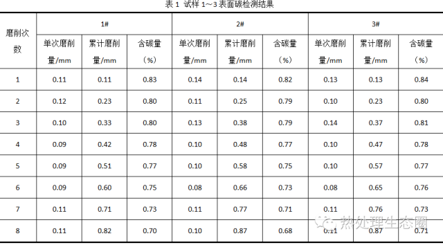 (4)表面碳檢測(cè)。①清潔表面碳試樣。②用千分尺測(cè)量試樣原始長(zhǎng)度并記錄。③平面磨削量0.1mm,測(cè)量長(zhǎng)度并記錄。④直讀光譜儀檢測(cè)表面碳含量并記錄。⑤每磨削0.1mm測(cè)定長(zhǎng)度及碳含量一次。