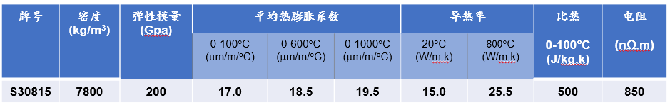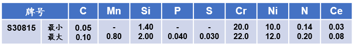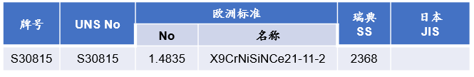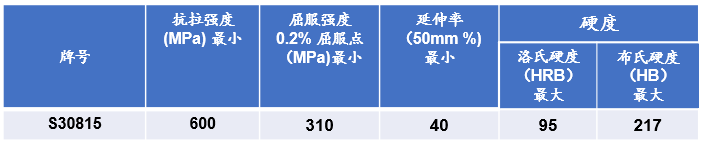 ASTM A240/A240M 規定了S30815扁平軋制產品(中厚板,薄板和卷材)的性能。 對于其他產品如相應規格的管材,規定了類似但不一定相同的性能指標。