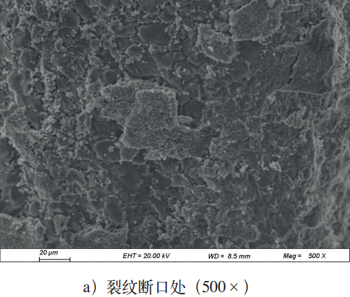 對裂紋斷口處采用掃描電鏡觀察,圖7a為陳舊斷口,從圖7b泄漏孔內(nèi)壁形貌可以看出,表面上均存在“泥紋花樣”腐蝕產(chǎn)物。