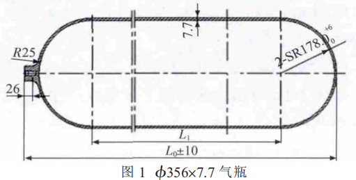 圖1展示了一個34CrMo4氣瓶(外徑為 準56mm,壁厚為7.7mm,總長為1555.6mm,彈性模量為210000 MPa, 泊松比為 0.3,最小抗拉強度為 950MPa,最小屈服強度為 820MPa)的結構設計圖。