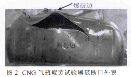 氣瓶失效的主要形式是疲勞斷裂,而疲勞斷裂的大多數原因是由于在循環高壓應力的工作環境中,氣瓶的內部或外部發生細小的脆性變形,產生裂紋,隨著載荷次數的增加,變形裂紋加劇直至后期迫使 整體或局部發生斷裂。實驗選用準356 mm×7.7mm,Rm(最大拉伸強度)低于1100MPa 的 34CrMo4合金鋼氣瓶, 并按照ISO11120氣瓶標準和熱處理加工工藝規范進行加工制造。但在氣瓶生產制造過程中,由于工藝差別、設備差別、人員操作等不可控因素影響,個別氣瓶的極限強度在遠小于設計要求下便發生爆破。具體表現為:選用同批次的 準356 mm×7.7 mm 的 34CrMo4 的調質鋼瓶,在常溫下進行周期性的壓力循環試驗中(循環壓力 2~30MPa,循環頻次 4~6 次 /min),當試驗循環到 4800 次時,瓶體發生爆破失效,這與ISO9809-1-2010《可重復充裝鋼瓶設計、制造和試驗》 (調質后抗拉強度小于1100MPa)標準規定的“循環次數不小于 15000 次、只允許泄漏失效”的要求相矛盾。爆破失效圖如圖2所示。