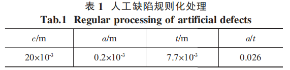 (1) 人工缺陷規則化處理無損檢測是利用聲、光、磁或電等特性,在不損壞或不影響被檢對象使用性能的前提下, 檢測被檢對象中是否存在缺陷或不均勻性,由此給出缺陷的大小、位置、性質和數 量等信息。按 照 GB/T5777-2008《無縫鋼管超聲波探傷檢驗方法》C5 級標準要求,鋼瓶無損檢測人工缺陷最大尺寸為 0.2 mm(深度)×40mm(長度),其規則化處理結果如表 1。