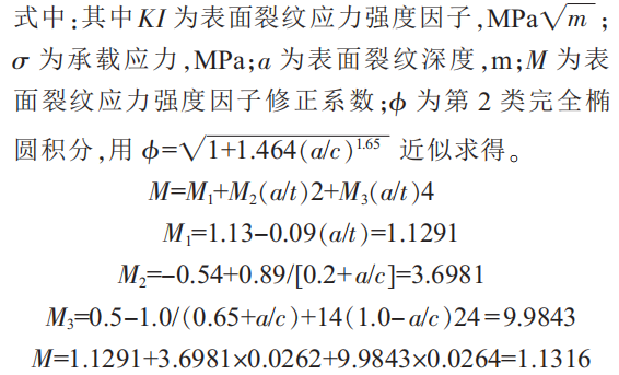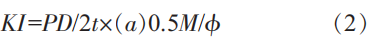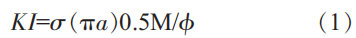 材料的裂紋強度因子KI是反應裂紋剪短應力強弱的重要物理參數。按照牛曼-瑞久(Newman-Raju)公式(1)可知表面裂紋應力強度表達為: