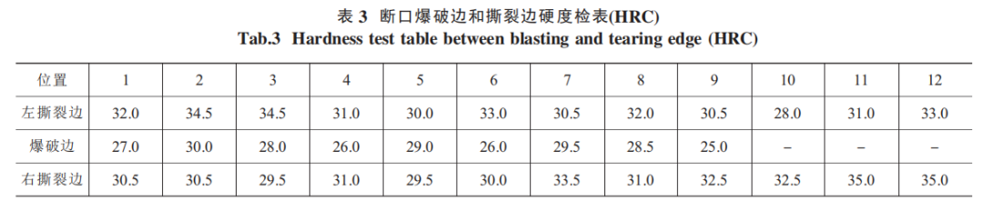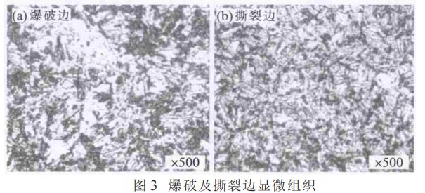 根據氣瓶設計要求,其抗拉強度為 950MPa~1099MPa(換算成硬度為30.5HRC~35.5HRC)?,F將存在的斷口爆破邊和撕裂邊進行處理,分別用電火花線切割,去除45°斜邊并磨平,進行表面硬度檢測(間距7mm),數據見表3。分析可知,爆破邊的硬度最低為25 HRC、最高30 HRC、平均27.7HRC,換算成抗拉強度為890MPa,比設計要求最小抗拉強度的保證值950MPa低了60MPa。由此可推斷,滲 碳體的聚集降低了爆破區的硬度,與氣瓶失效有關。