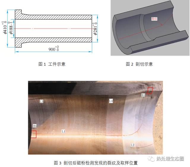 最近接觸到一批長筒工件(見圖1),在成品回廠驗收時,發(fā)現(xiàn)4件產(chǎn)品內(nèi)孔表面有裂紋,對其中最為典型的以一件進行剖切取樣分析,如圖2、圖3所示。