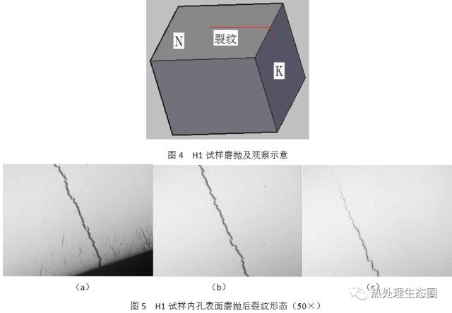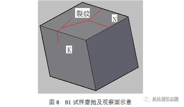 將B1試樣(見圖8)分別沿N面和K面進行磨拋并侵蝕(N為內(nèi)孔表面,K為沿壁厚方向磨拋面),并在顯微鏡下依次觀察裂紋形態(tài)及其附近顯微組織。