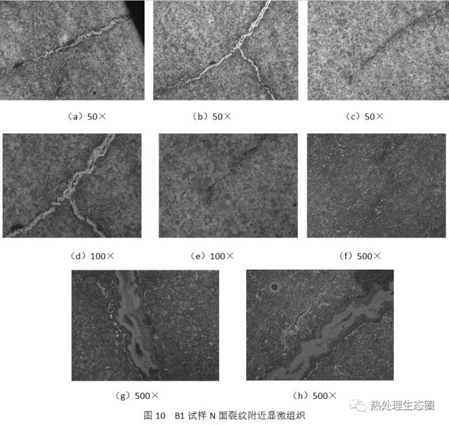 從試樣磨拋后觀察到的裂紋形態(tài)來說,試樣H1和試樣B1內(nèi)孔表面和壁厚方向上裂紋尖端均呈現(xiàn)比較尖銳的特點,其擴展路徑上則呈現(xiàn)出穿晶的特征,是典型的淬火裂紋。從侵蝕后的顯微組織來看,兩個試樣裂紋附近的顯微組織均為回火索氏體,未發(fā)現(xiàn)大塊狀鐵素體及長條狀鐵素體分布,裂縫兩側(cè)未發(fā)現(xiàn)明顯的氧化脫碳層。這說明,裂紋是在熱處理過程中形成的。