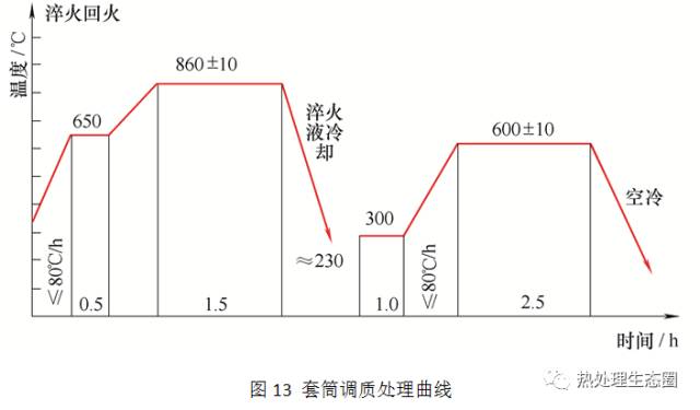 從套筒實際熱處理過程來看,其實際熱處理工藝曲線如圖13所示,生產(chǎn)過程未發(fā)現(xiàn)異常。