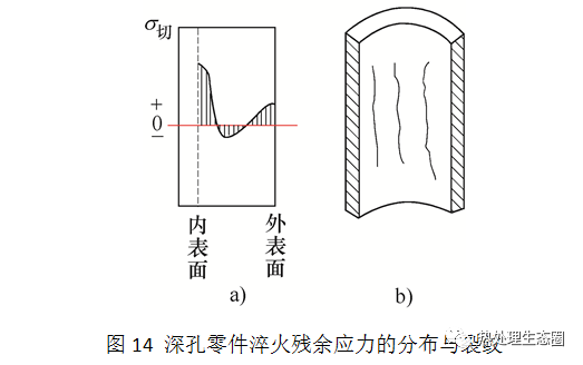 實際上,對于長筒成品件來說,壁厚分別為40mm(薄壁端)和52mm(厚壁端),總的來說,內(nèi)孔比較長,內(nèi)徑較小且壁厚屬于42CrMo4鋼,可以完全淬透的范圍,淬火時組織應(yīng)力比較大。同時,對于內(nèi)徑較小的深孔零件,由于內(nèi)表面比外表面冷卻速度小得多,殘余熱應(yīng)力的作用小,則受到的拉應(yīng)力比外表面大,易在內(nèi)表面形成縱向裂紋,甚至多條并列(見圖14)。