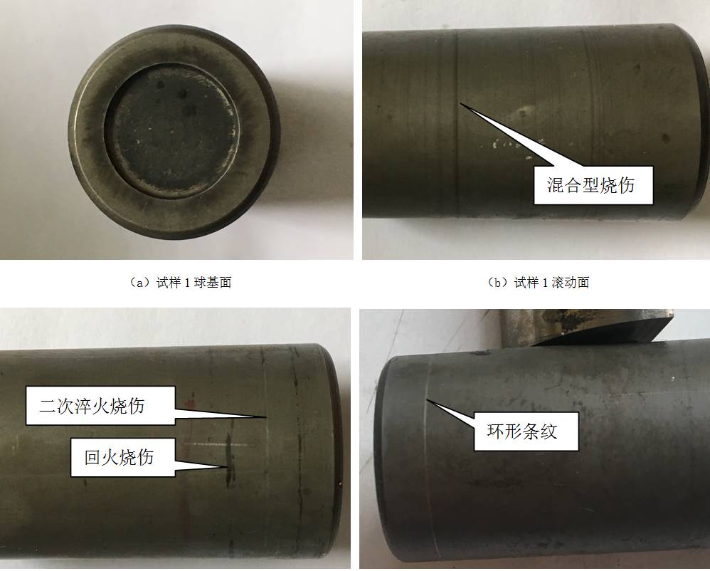 對使用中異常升溫的軸承,拆套并清洗軸承滾子。肉眼觀察工件表面顏色無明顯變化,可以看到其表面無裂紋、無破碎、無剝落痕跡,但滾子滾動面上存在有環(huán)形條紋,滾子滾道表面有劃傷,手感這些劃傷部位未有凹凸感,滾動球基面似有變色現(xiàn)象,但不明顯。但由于摩擦的作用產(chǎn)生的熱能,增加了發(fā)生熱損傷的可能性。
