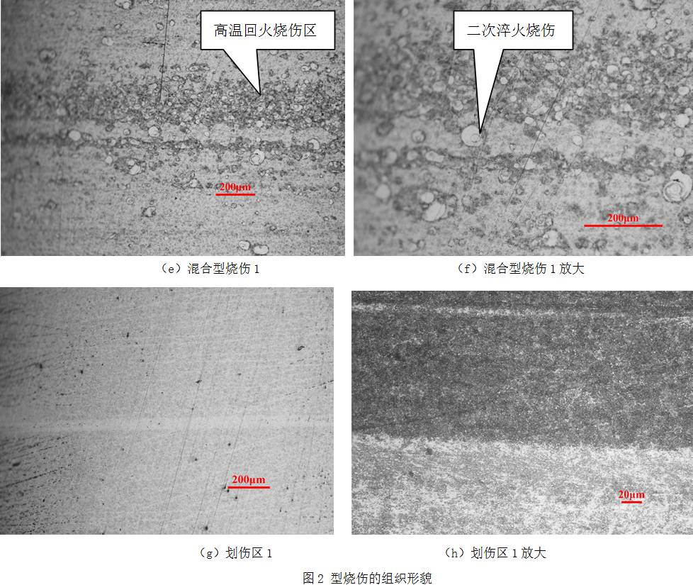 在滾動面上既有二次淬火燒傷,也有高溫回火燒傷,其組織形貌見圖2 e和2f。在滾動面沿徑向方向的黑色條紋(酸洗后呈現(xiàn))區(qū)域,可觀察到有數(shù)個大小不一、圓形或接近圓形的白色二次淬火燒傷微區(qū),長度不大于50μm;還有部分的高溫回火區(qū)以及正常區(qū)域同時共存的組織形貌。