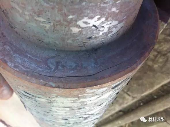 合金鋼采用水空交替淬火,空冷時間控制很重要。如果空冷時間太長,得不到淬火馬氏體,如果空冷時間太短,淬火太劇烈,臺階部位應力過大,容易產生淬火裂紋,如圖4所示。工藝試驗必須進行小批量多次試驗,質量穩定后方可進行批量生產。