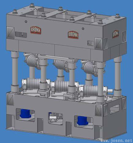 ? 矯直過程中所施加的載荷是靠堅固的鋼結構頂蓋和底座來承受的, 頂蓋和底座是靠數根圓形鋼立柱連在一起的。 底座支撐五個下工作輥, 每個工作輥安裝在一對軸承座之間,靠螺栓把在輥子托盤上, 每個輥子托盤通過一圓孔安裝在底座上。 頂蓋的設計總的來說是類似的設計和結構,用以支撐五個上工作輥。