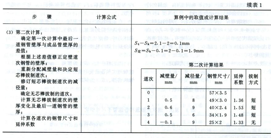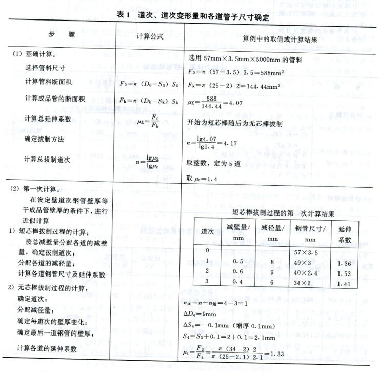 工藝程序表    表1為拔制25mmx2mm鍋爐管的拔制道次和各道變形量計算。表2為拔制力計算和拔管機選擇。表3為輔助工序和模具類型選擇。