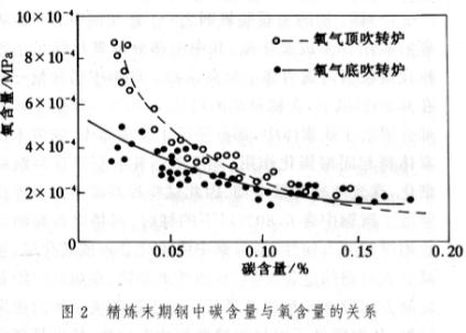 (5)氧。鋼中有害元素。由于煉鋼前期加入礦石、吹氧或吹空氣,鋼水中不可避免地溶有一定的氧。在精煉的末期,鋼中氧含量取決于碳含量。碳含量高,則氧含量低。氧氣頂吹和底吹轉爐精煉末期,鋼中碳含量與氧含量的關系如圖2所示。
