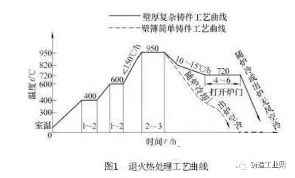 具體工藝( 工藝曲線見圖1 , 以壁厚不超過100mm且外形較復雜鑄件為例) 如下。