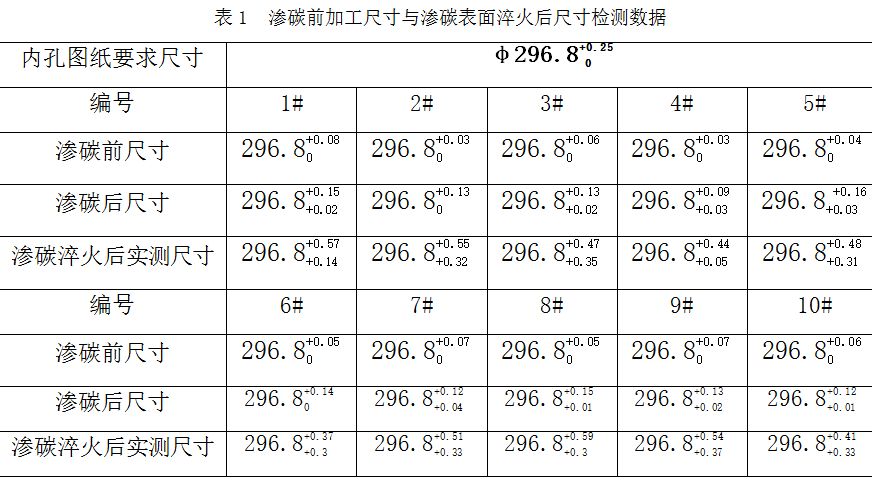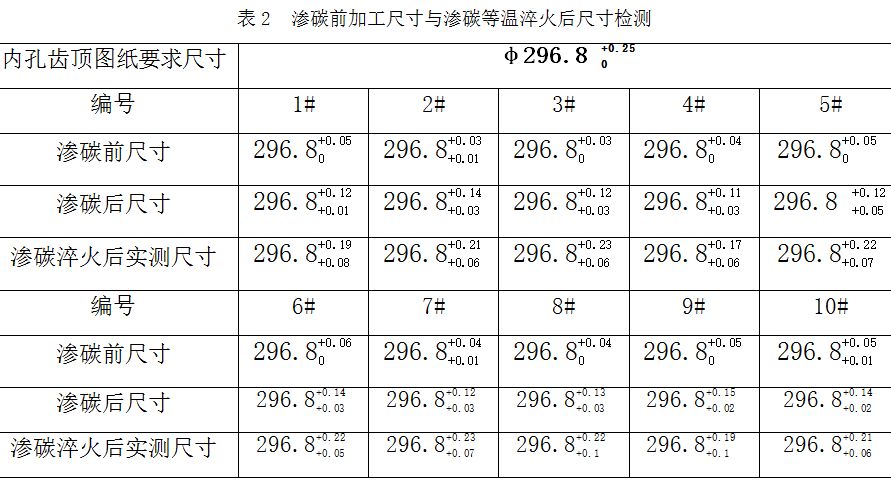 感應淬火后硬度檢測結果符合圖紙的技術要求。對內齒齒頂尺寸φ296.8H7采用內徑千分尺進尺寸檢測,數據如表1所示:由尺寸檢測結果可以看出,10件工件內孔整體均呈現向外脹的趨勢,脹大量在0.4~0.6mm,齒側后序無法進行磨齒滿足最終成品的尺寸要求,零件全部報廢。此內齒套滲碳后齒面為高碳合金成分,采用中頻單齒淬火,組織轉變時產生的組織應力及熱應力導致工件外脹變形,另外工件心部及其他部位未進行淬火,強度低,內應力超過基體的屈服強度引起工件外脹變形超差而報廢。