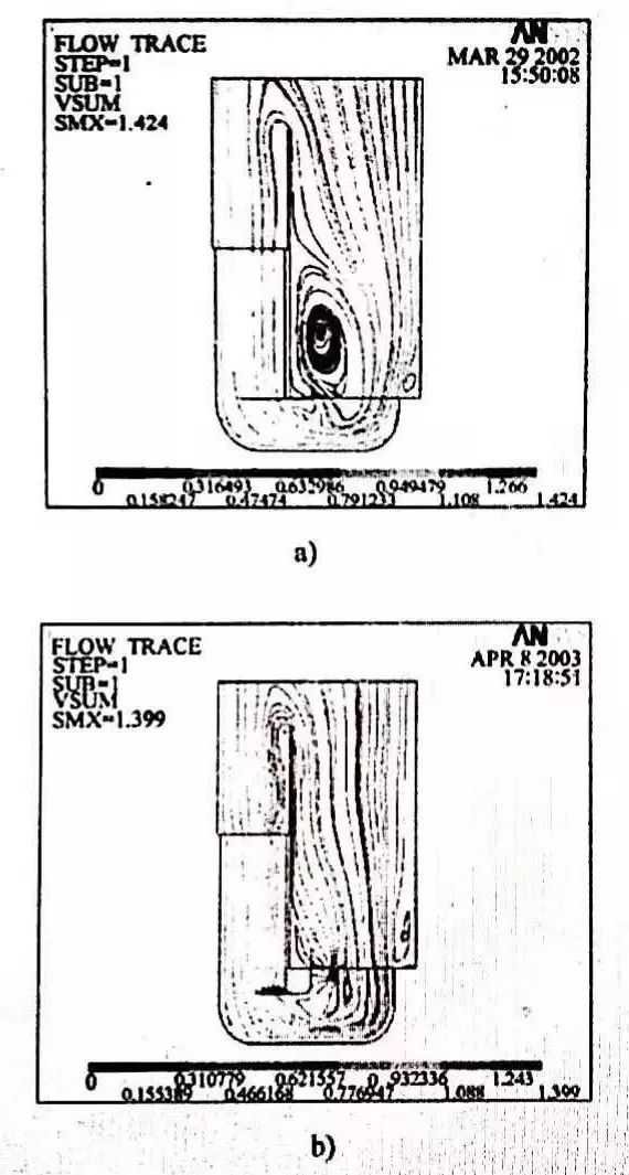 圖19 所示為無均流片和有均流片情況流體分布的模擬流線圖,該結果與實測結果基本吻合。