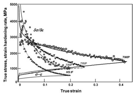 高強度IF鋼,TRIP鋼和TWIP的應變硬化行為對比。