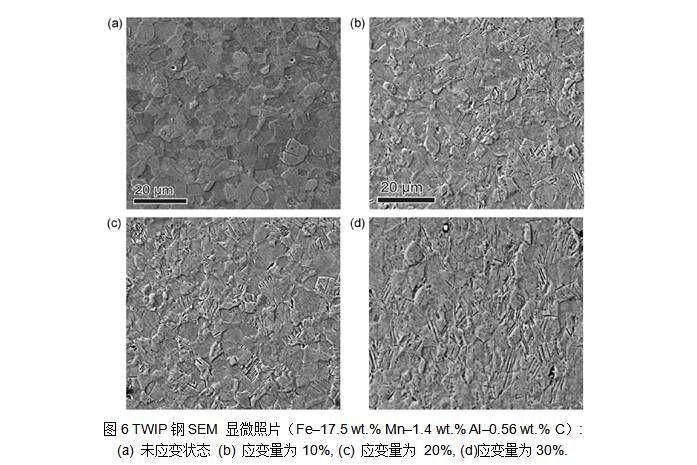 室溫下,TWIP鋼具有較低的層錯能( 20~50 mJ/m2),盡管TWIP鋼中應變強化的控制機制細節尚不清楚,通常認為,TWIP鋼高的瞬時應變硬化被認為是由于形變孿晶體積占比的增加引起的。