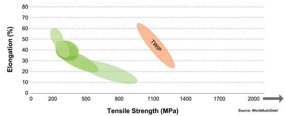 TWIP鋼不僅具有極高的強度,同時還具有極高的翻邊成形性能。在工程應變約為30%時,其n值上升為0.4,并在隨后的變形過程中保持恒定,直到其均勻伸長率和總伸長率達到50%為止。TWIP鋼的抗拉強度達到1000 MPa以上。