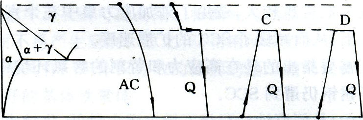 獲得雙相組織的方法 鐵素體一馬氏體雙相組織,可以通過在(%26alpha;+%26gamma; )兩相區加熱后冷卻的雙相化熱處理,或者通過直接熱軋而得到。鋼中合金元素或原始組織的不同,雙相化熱處理工藝或熱軋工藝的不同,都會明顯影響或改變雙相組織的形態和馬氏體與鐵素體的相對量。圖1所示為獲得不同類型雙相組織的基本工藝方法。借助鐵碳相圖,低碳低合金鋼分別采用圖中A、B工藝和C、D工藝雙相化熱處理以后,可得到A、B、c、D相應4種特征的雙相組織。由于低碳非合金鋼奧氏體的淬透性小,采用A工藝難以獲得雙相組織。而低碳低合金鋼,采用上述4種工藝,原則上都可在鐵素體上控制得到不同量的馬氏體。隨鋼中碳及合金元素含量的增多,奧氏體的淬透性越大,雙相化處理最后冷卻階段的冷速即可相應減小。圖中的顯微組織示意圖,畫影線的區域表示馬氏體,白色基體表示鐵素體。A、B兩類雙相組織均為不規則的塊狀馬氏體區分布在鐵素體的基體上。A類組織由%26gamma; 單相區連續空冷至室溫而得到,在通過(%26alpha;+%26gamma; )兩相區的過程中首先形成鐵素體,剩余的具有足夠大淬透性的奧氏體,在隨后冷卻時轉變成馬氏體。B類組織的獲得與A類稍有不同,由%26gamma; 區冷至(%26alpha;+%26gamma; )兩相區后,在給定的特定溫度保溫一段時間,以便于控制一定數量的鐵素體,之后剩余的富碳奧氏體在淬火時轉變成馬氏體。這種方法常稱為階梯淬火。c類組織,由(%26alpha;+珠光體P)的原始組織加熱到(%26alpha;+%26gamma; )兩相區,保溫后淬火而得到。這種方法用得最早,英、美文獻中常稱之為亞臨界退火。這類雙相組織中的馬氏體區多呈島狀或由島連成的網狀,這要取決于加熱的溫度和時間。D類組織,以淬火態的低碳板條馬氏體(M)為原始組織,加熱到(%26alpha;+%26gamma; )兩相區給定的溫度,保溫后再次淬火而得到。這種方法稱為雙淬火或中間淬火。這類組織中的馬氏體,多呈細密的纖維雙shuana狀。以上4類組織都是通過專門的熱處理而得到的,即通常所說的熱處理雙相鋼。借助圖1中A、B兩種工藝曲線,也可定性說明熱軋雙相鋼中雙相組織的獲得方法。如工藝A,假定曲線中A點所示溫度為終軋溫度(當然終軋溫度也可以在(%26alpha;+%26gamma; )兩相區),然后連續空冷到室溫,這便是熱軋一空冷雙相鋼:又如工藝B,假定B點所示溫度為終軋溫度(同樣,終軋溫度也可以在(%26alpha;+%26gamma; )兩相區),然后采用由計算機控制的給定的不同方式階梯冷卻工藝冷至室溫,這便是熱軋一控冷雙相鋼。總之,上述基本工藝方法皆適用于沖壓型或非沖壓型雙相鋼(熱處理或熱軋類)。需要根據鋼的成分、工藝設備等條件的不同,分別選取不同的方法???、的原則是,鋼中增大淬透性的合金元素含量越多,獲得雙相組織的冷速就可減慢。或者說,只要具備足夠大的冷速條件,就可減少鋼中合金元素的含量。